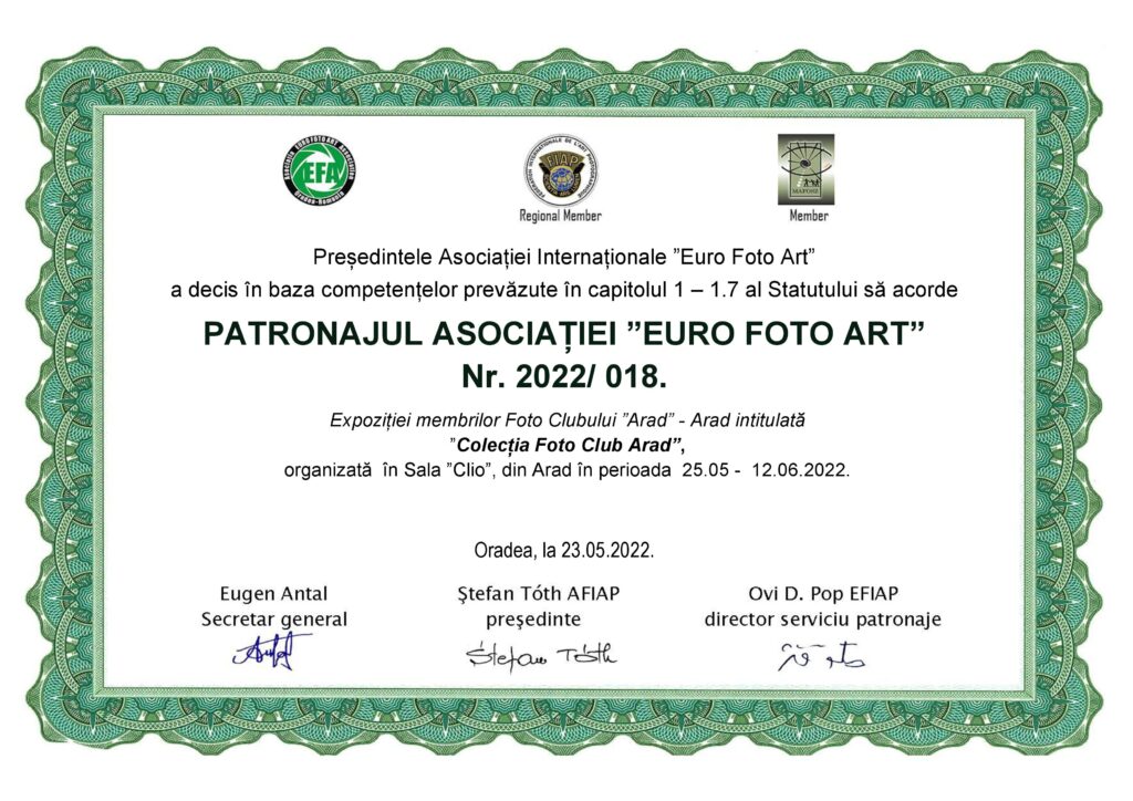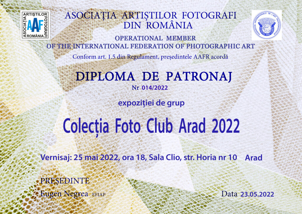 Asociația Foto Club Arad în parteneriat cu Complexul Muzeal Arad sub patronajele Asociației Artiștilor Fotografi din România nr. 014/2022 și Asociația Euro Foto Art nr. 2022/018, vă anunță că miercuri, 25 mai 2022, ora 18, va avea loc vernisarea :